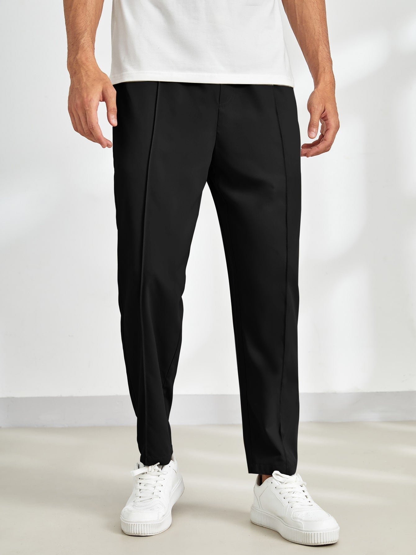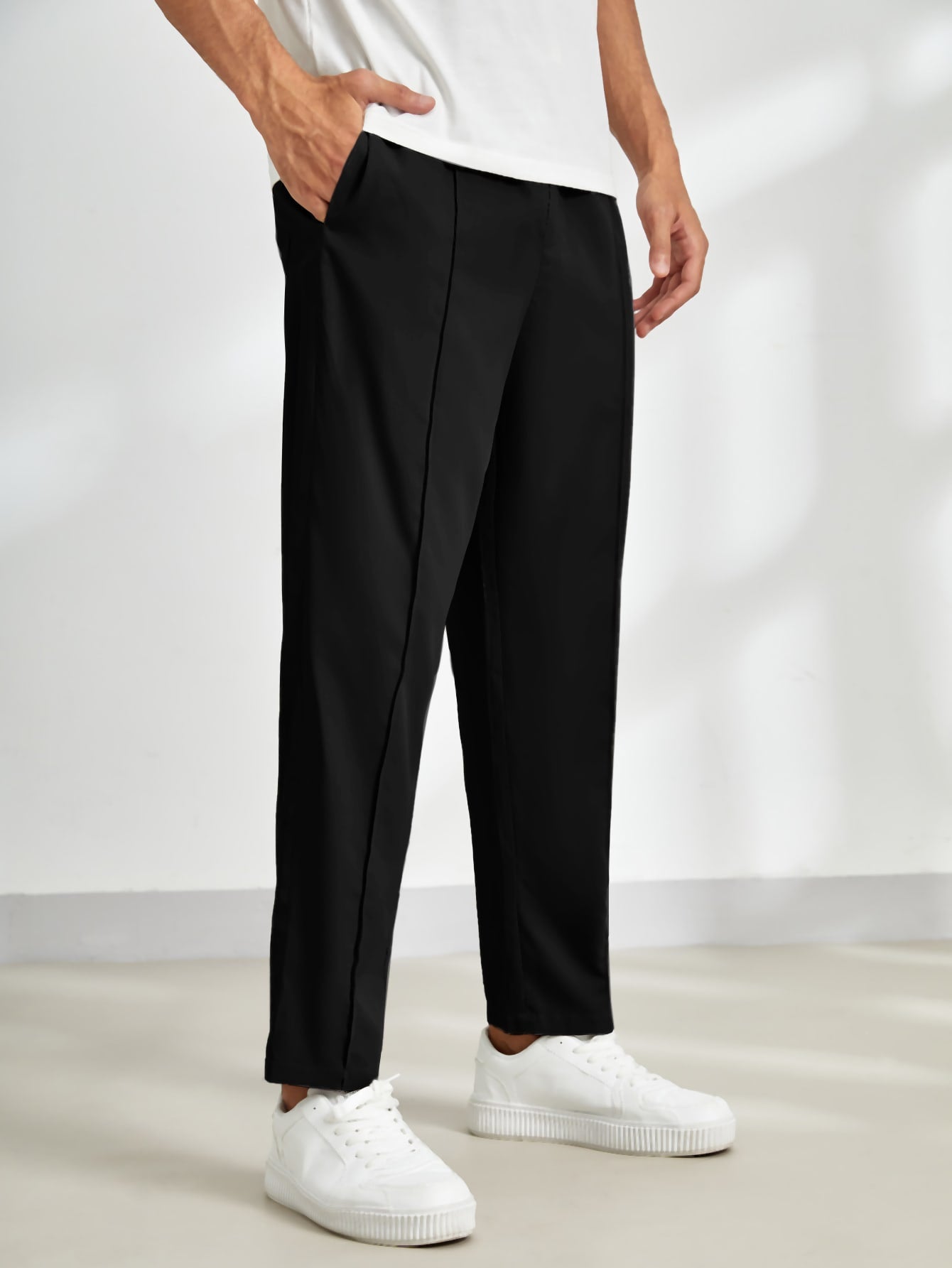 These black tailored trousers offer a sleek and versatile look, perfect for casual and semi-formal outfits. The clean lines and minimalistic design enhance their modern appeal.